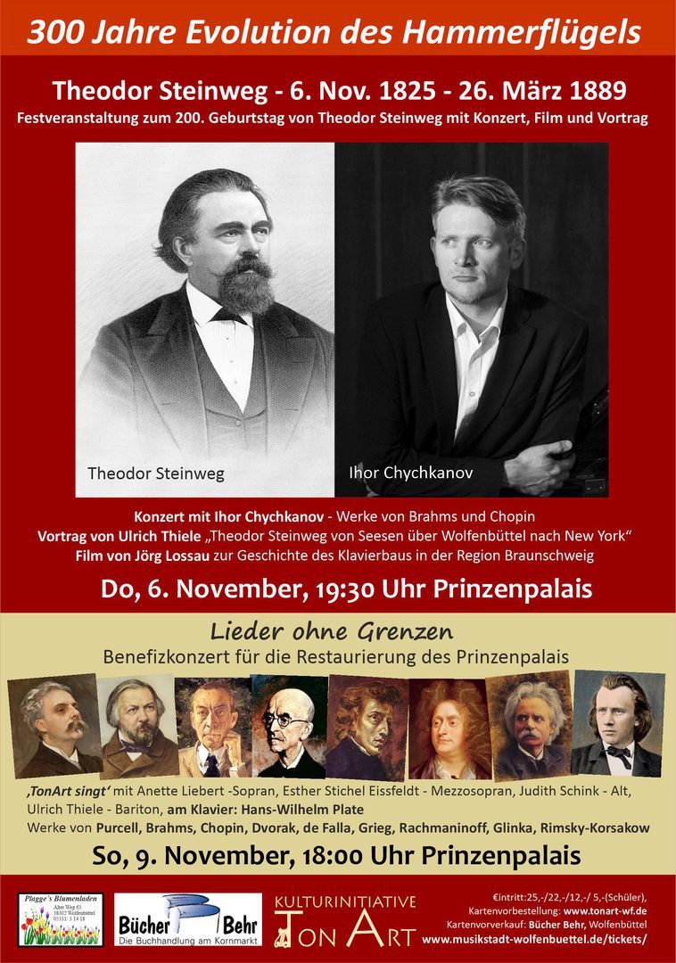 Das Prinzenpalais mit seiner Instrumentensammlung in der unmittelbaren Nachbarschaft der damaligen Wolfenbütteler Niederlassung Steinwegs ist der richtige Ort für ein Festkonzert am hauseigenen Theodor-Steinwegflügel mit einem Vortrag zur Geschichte von Steinweg zu Steinway und Grotrian und einem Film von Jürgen Lossau zur Geschichte des Klavierbaus in Braunschweig.