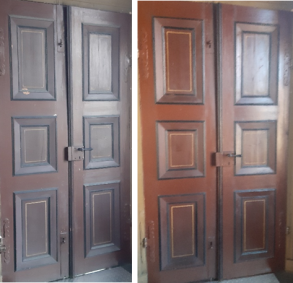 Auf dem Bild sieht man schön den Unterschied zwischen überarbeitet im Saal (links) und bisheriger Zustand am Flurfenster rechts.