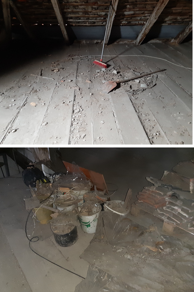 Sie hat die monatelange Nutzung als Müllplatz, zuerst für die Wohnung unter dem Saal, dann für den Dachboden, nicht überstanden.